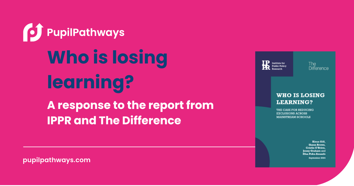 This blog outlines the way in which we believe Pupil Pathway’s products can help schools and local authorities meet some of the challenges outlined in the report Who is losing learning?: The case for reducing exclusions across mainstream schools*, released in September 2024 by the IPPR and The Difference.